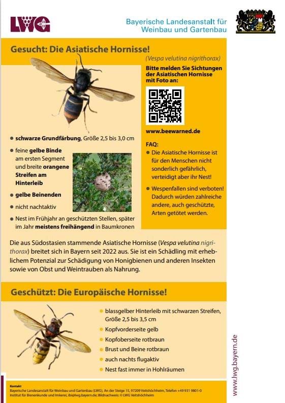 Die Asiatische Hornisse wurde mittlerweile auch in Kirschfurt und Collenberg gesichtet. Diese invasive Insektenart, ohne natürliche Fressfeinde hier bei uns, stellt eine Gefahr für die Bienen, damit für die Natur, aber auch den Menschen dar.